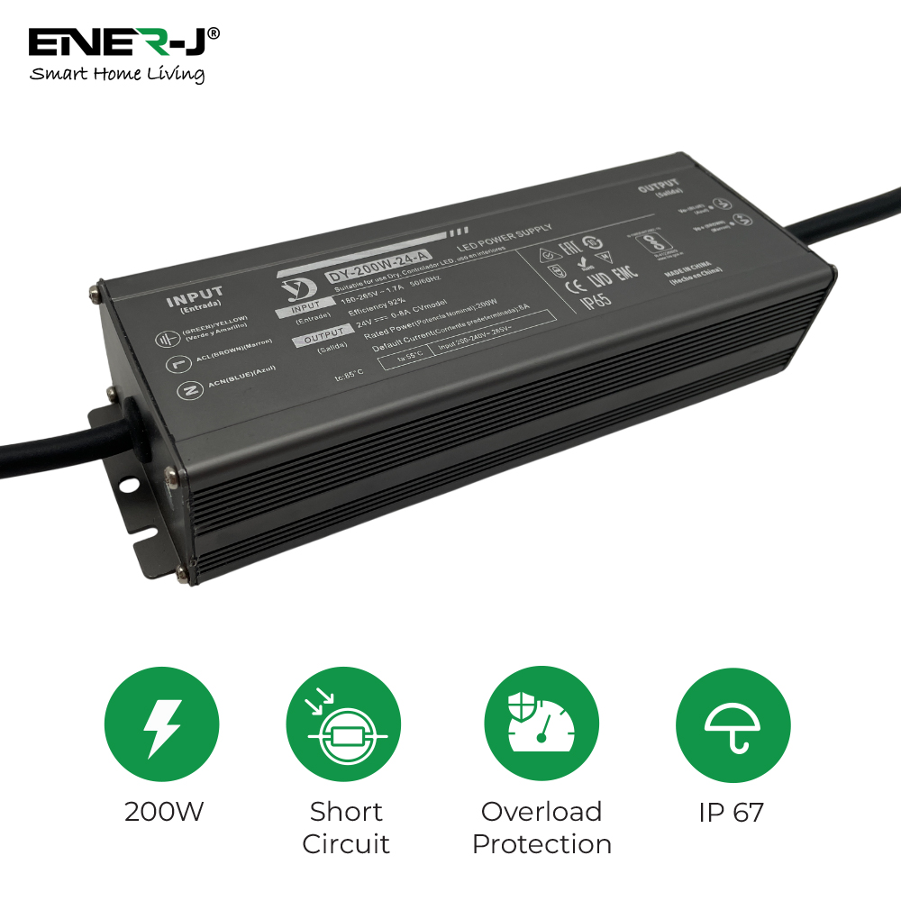 ENER-J Waterproof 200W 24V Power Supply – Constant Voltage LED Driver (IP65/IP67 Rated)