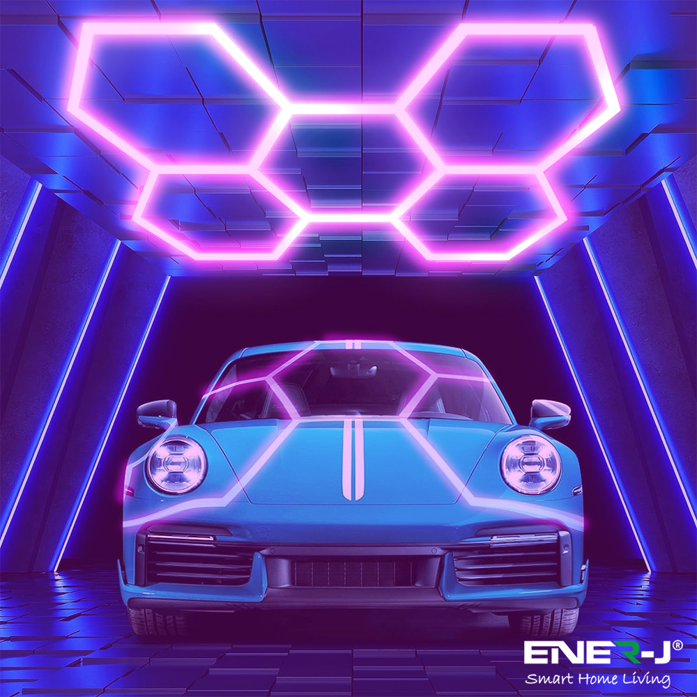 Transform your showroom into a captivating space with ENER-J Hexagon Shape Showroom LED Lights. Order now and experience superior lighting performance! 2347mm*1641mm *22mm (24pcs) PC T5 Tubes, RGB |