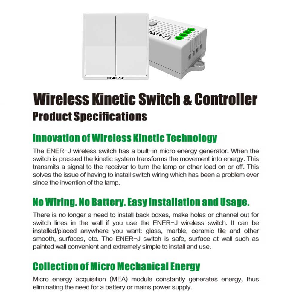10A RF Non Dimmable Receiver to be used with Our PRO SERIES Wireless Kinetic Switch. The receiver is simply wired between light fixture and power supply. Max Load 1000W (including LEDs)