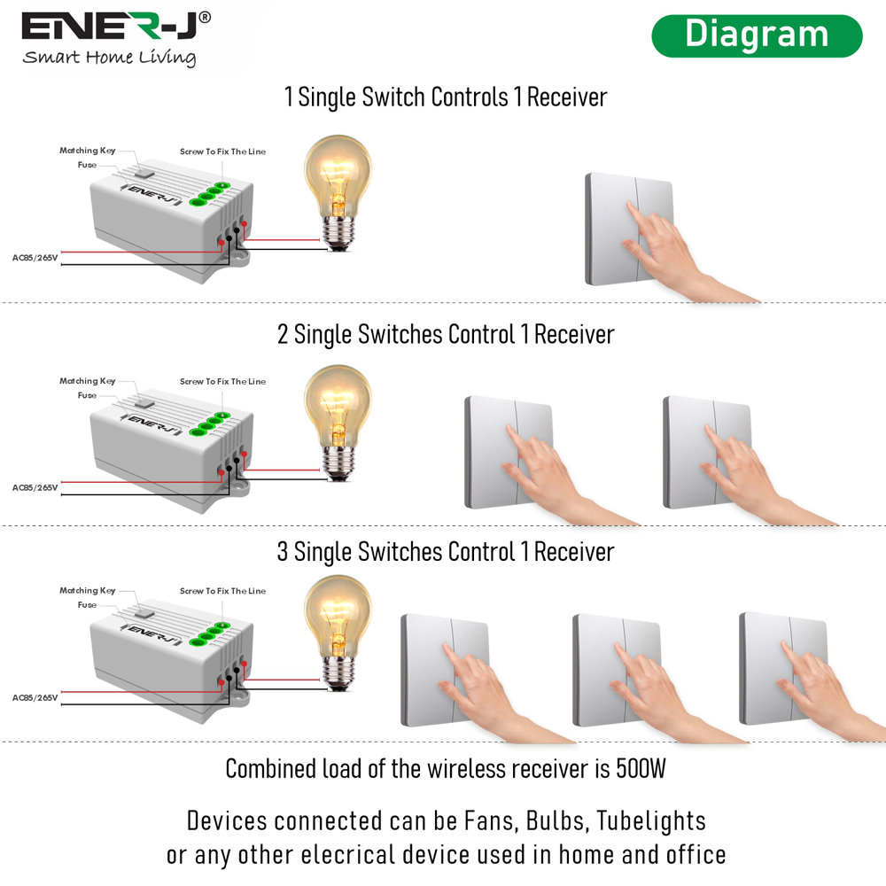 - Can be used 2/3 Way. Multiple Switches can control one receiver and vice versa thereby eliminating the need to do 2 way rewiring Range and Usage: The effective range between transmitter and receiver (not included in the package) is approximately 30 meters indoors and approximately 100 meters outdoors. ENER-J receiver (not included in the package) can connect to multiple ENER-J switches. Ideal to control your garden house, and outdoor lighting from the comfort of the house! Never route power cables, ready for use: No slots knocking, no junction box required. Wireless use without drilling and screws.