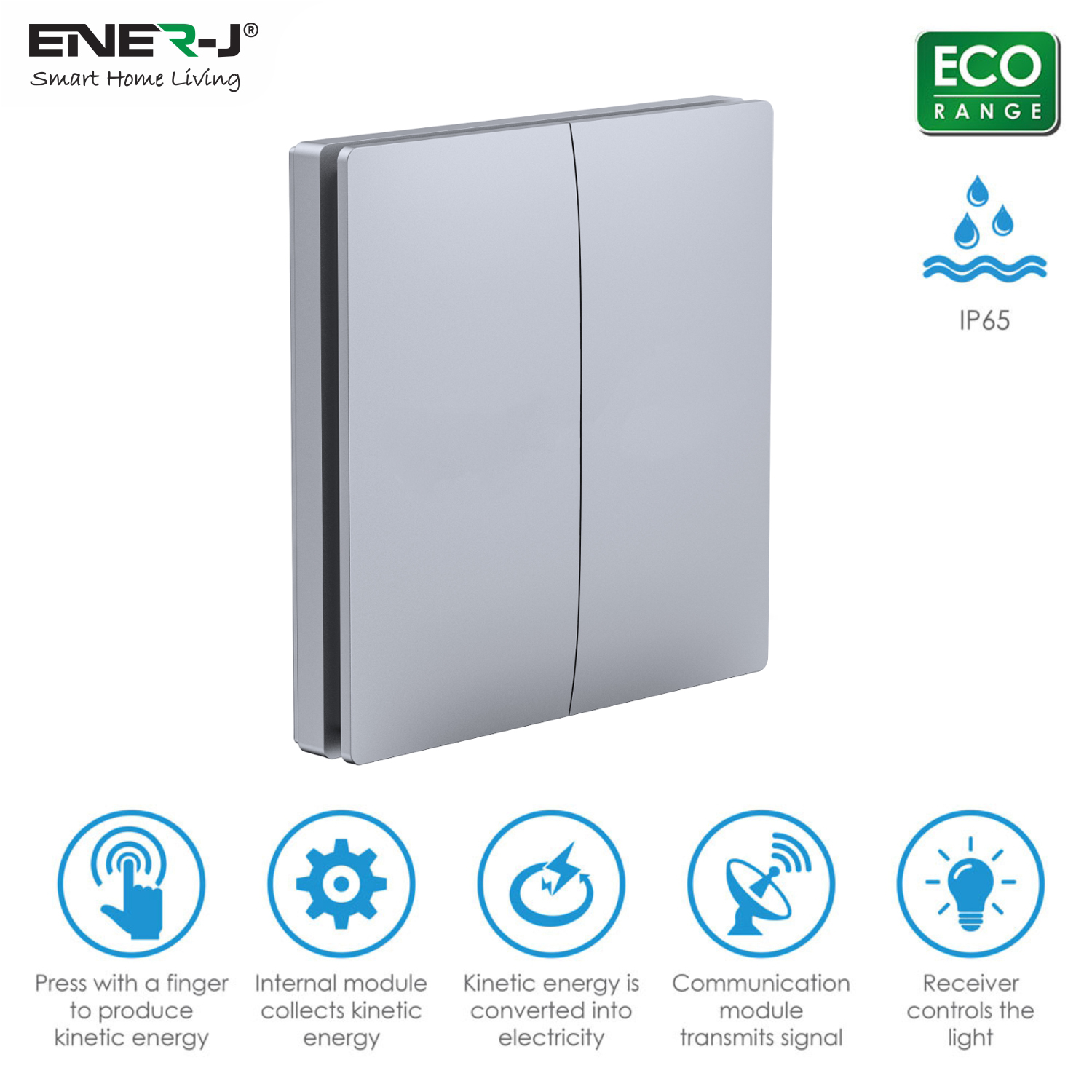 ENERJ 2 Gang Wireless Kinetic Switch Silver + 2 units of 500W RF Receiver